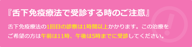 この治療法ではスギ花粉またはダニのエキスを舌下に毎日だんだん濃い濃度にして増やしていきます。さらにこの毎日スギ花粉またはダニエキスを舌の下に置くことを最低2年間続け、この2年間は毎月1回必ず通院が必要です。根気がない方には向いていない治療法です。また、治療を中断したら、場合によっては初めの濃度から治療を再開する必要になることがあります。なお、この治療の副作用にアナフィラキシーというものがありますが、最悪の場合命が危険にさらされる場合があります。そのため1回目のスギ花粉またはダニのエキスを置くのはクリニックでお医者さんが行い、置いた後30分はクリニックの中で過ごしていただき、副作用が起こらないか確認する必要があります。また、現在高血圧で薬を飲まれている方、妊婦の方はこの治療を受けることができません。また、口の中にスギ花粉またはダニのエキスを置くので、口の中を傷つけたり、歯医者さんで治療をしたり、口内炎ができた場合は治療を中断する必要があります
